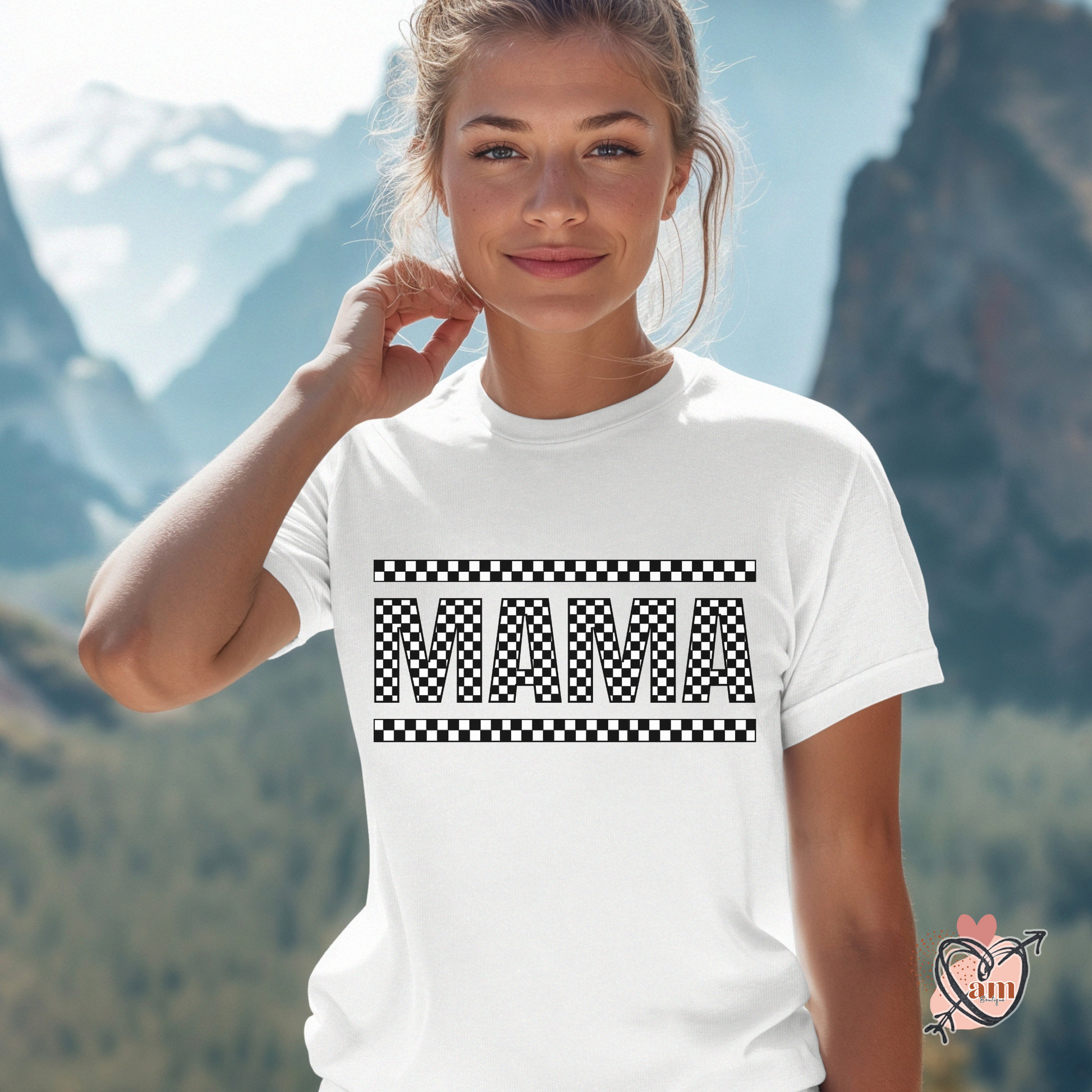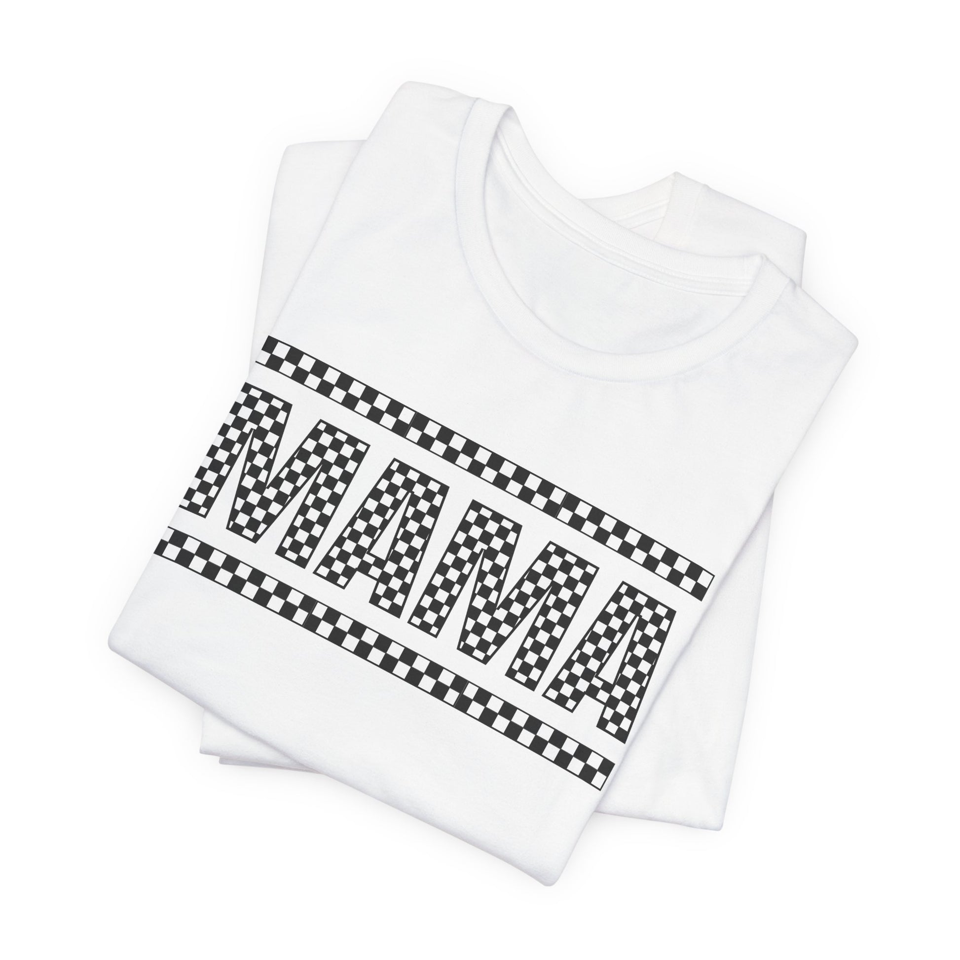 Elevate your mom style with our Checkered 'MAMA' T-Shirt. Crafted from 100% Airlume combed and ring-spun cotton, this unisex tee delivers unmatched comfort while making a bold statement. The lightweight, breathable fabric keeps you cool through busy days, while the retail fit and classic crew neckline transition effortlessly from playground visits to coffee.