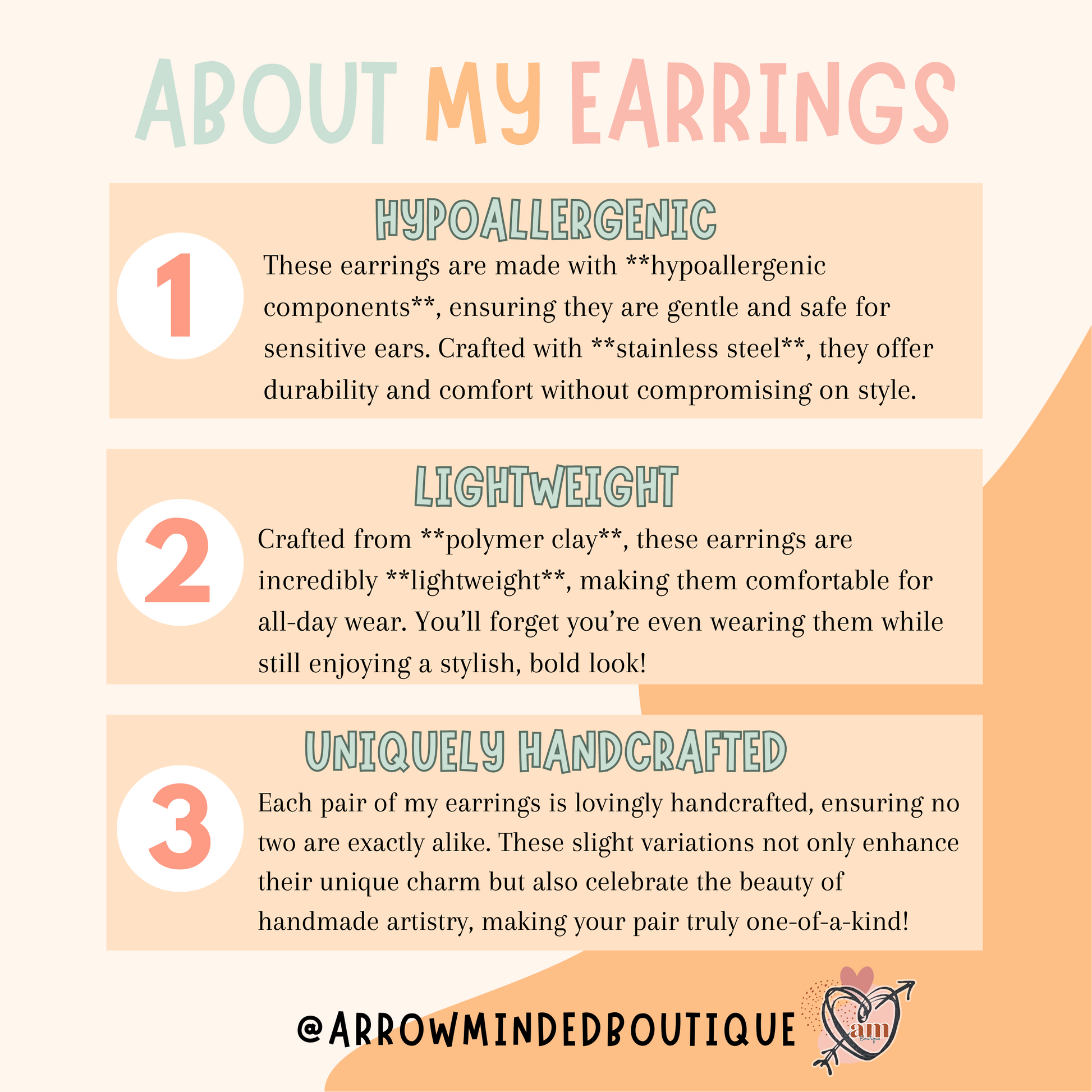 All of my earrings are handcrafted, no two pair will be exactly the same and may have very slight variations. This adds to their unique charm and highlights their handmade nature. The best part about polymer clay earrings is that they are lightweight and are made to last!