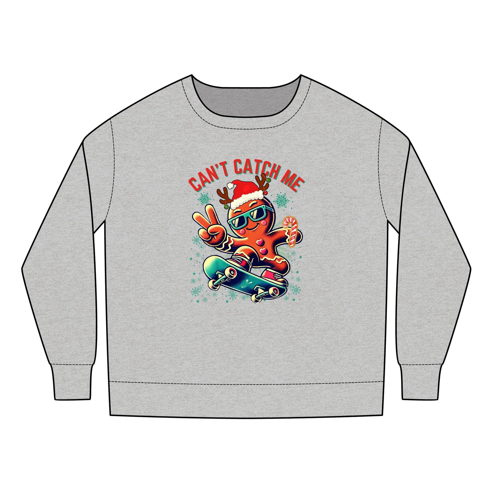 This adorable toddler sweatshirt features a cute design of a Gingerbread Man on a skateboard with the phrase 'Can't Catch Me'. Perfect for little ones who love fun and playful clothing. Ideal for the holiday season and everyday wear.