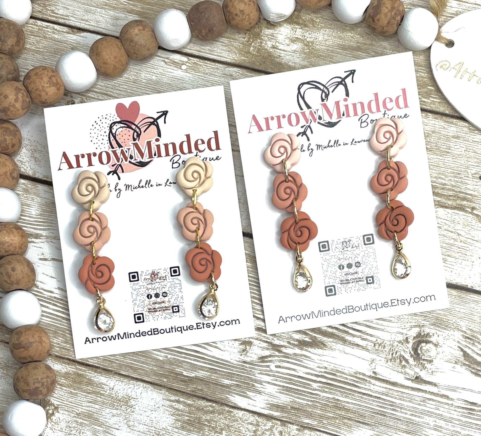 Experience the beauty and intricacy of these Peachy Rose Dangles. Made from the finest polymer clay, these Bohemian-style earrings are adorned with delicate spring florals. Not only are they hypoallergenic with gentle ear posts, but they are also lightweight for comfortable wear. Give the gift of uniqueness with these one-of-a-kind handmade earrings.