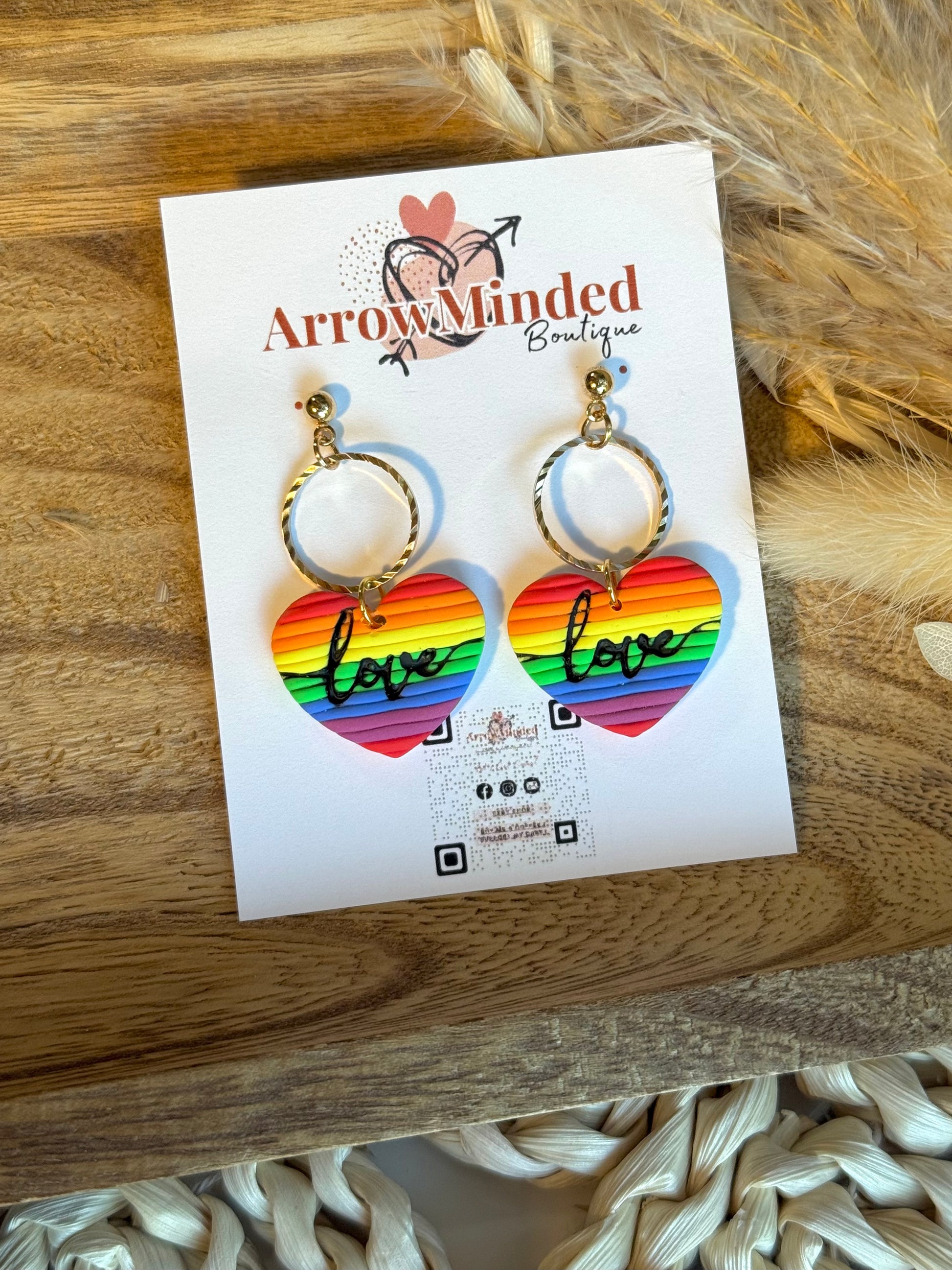 Introducing our Handmade Love Out Loud Earrings, the perfect way to show your pride! These earrings are handmade from lightweight polymer clay and feature a rainbow colored heart with "love" stamped in the middle. The hypoallergenic components and stainless steel gold ear posts make them perfect for everyday wear. Give the gift of love and pride with these thoughtful and stunning earrings.