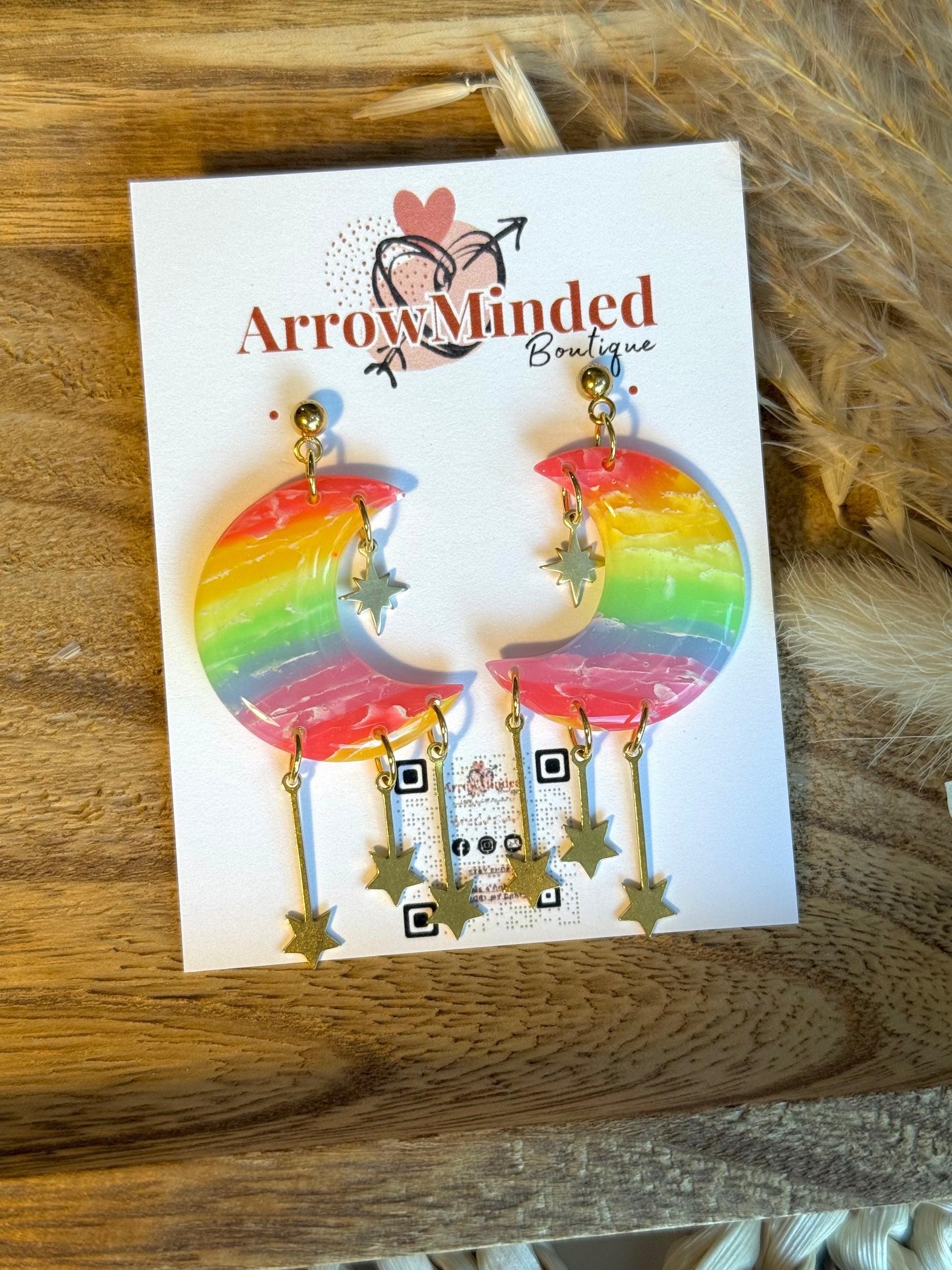 These Handmade Moonlight Magic Earrings are a beautiful addition to any outfit! Made from lightweight polymer clay and featuring a stainless steel gold ear post, these earrings are perfect for those with sensitive ears. Show your pride with the vibrant colors of the rainbow and give a thoughtful gift to yourself or a loved one.