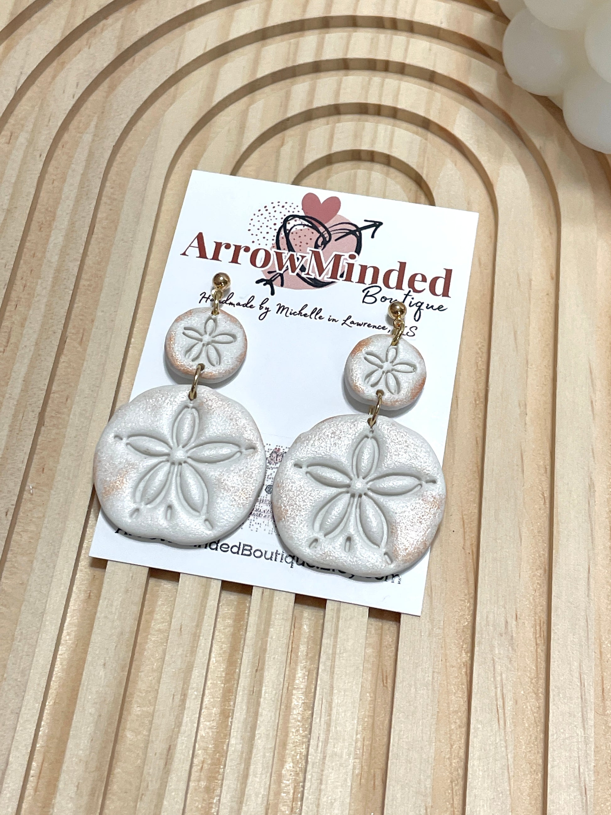 Embrace the beauty of the beach with our Handmade Shimmery Sand Dollar Dangle Earrings. Crafted with hypoallergenic gold ear posts, these lightweight polymer clay earrings are perfect for those with sensitive ears. Add a touch of boho style to your summer outfits and make a unique statement with these handmade earrings. Perfect for gifting to those who love the ocean and warm summer vibes!
