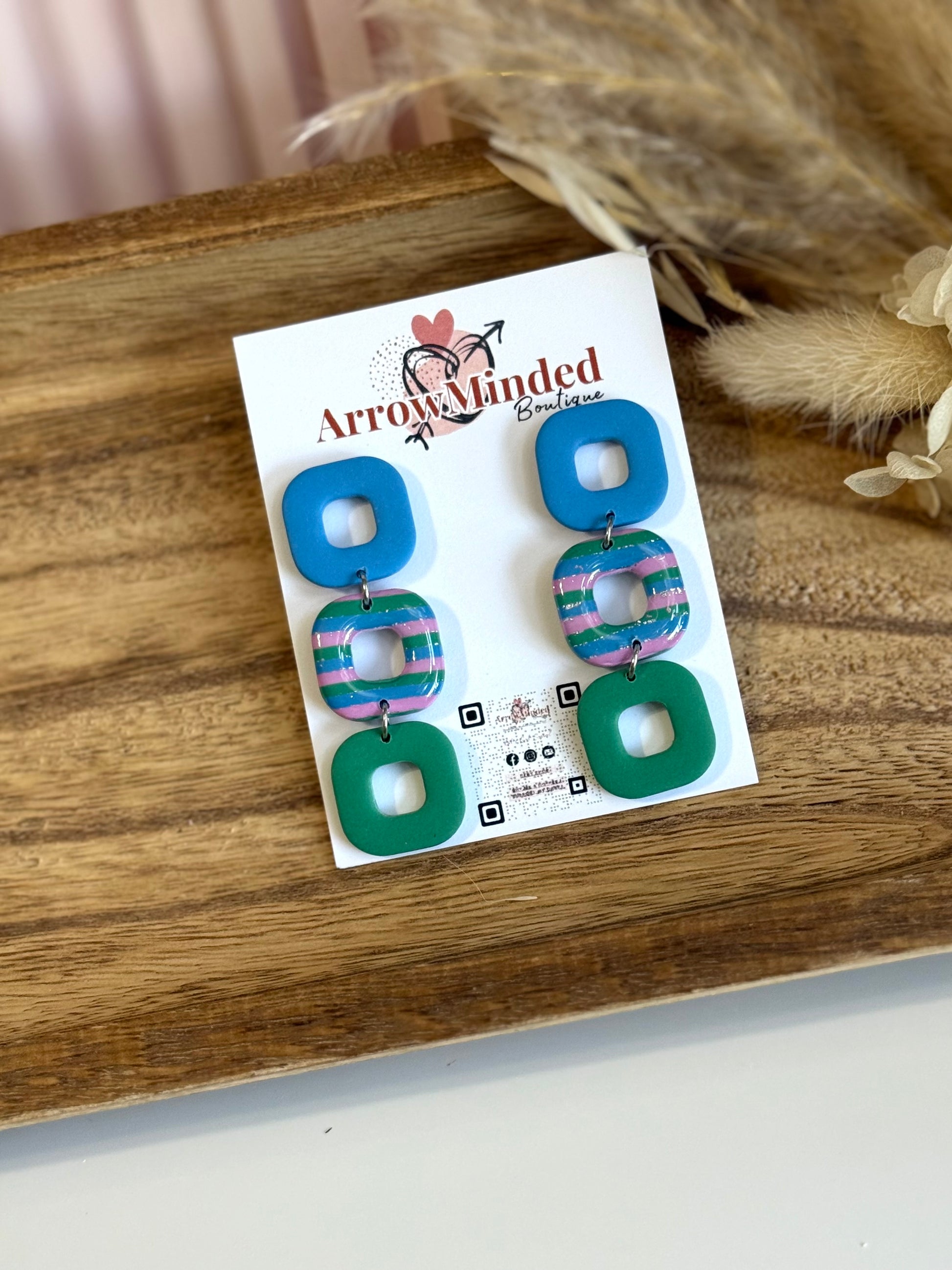 Handcrafted from lightweight polymer clay in soft hues of blue, green, and violet, this design feels fresh yet grounded. Finished with hypoallergenic stainless steel ear posts, they’re as gentle on the ears as they are bold in style.