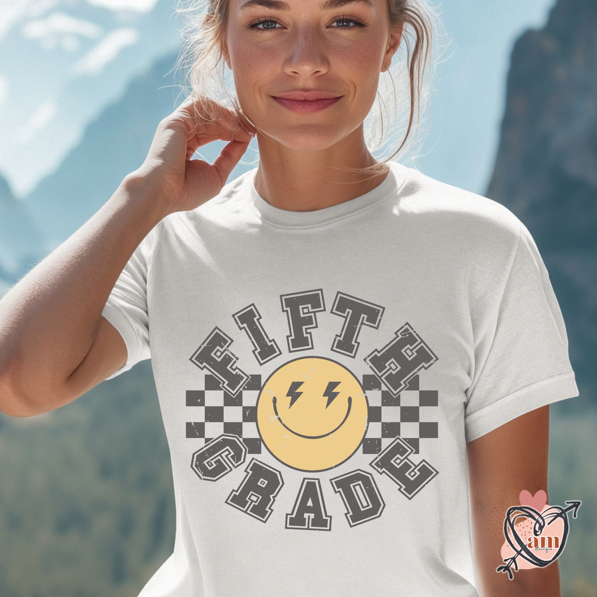 This Retro Emoji Checkered T-Shirt is a fun and customizable piece perfect for teachers of various grade levels, from Pre-K to Fifth Grade. It gives off a playful and energetic vibe, making it a great addition to a teacher's wardrobe. Ideal for teacher groups and can be worn during school events, teacher appreciation days, and casual Fridays.