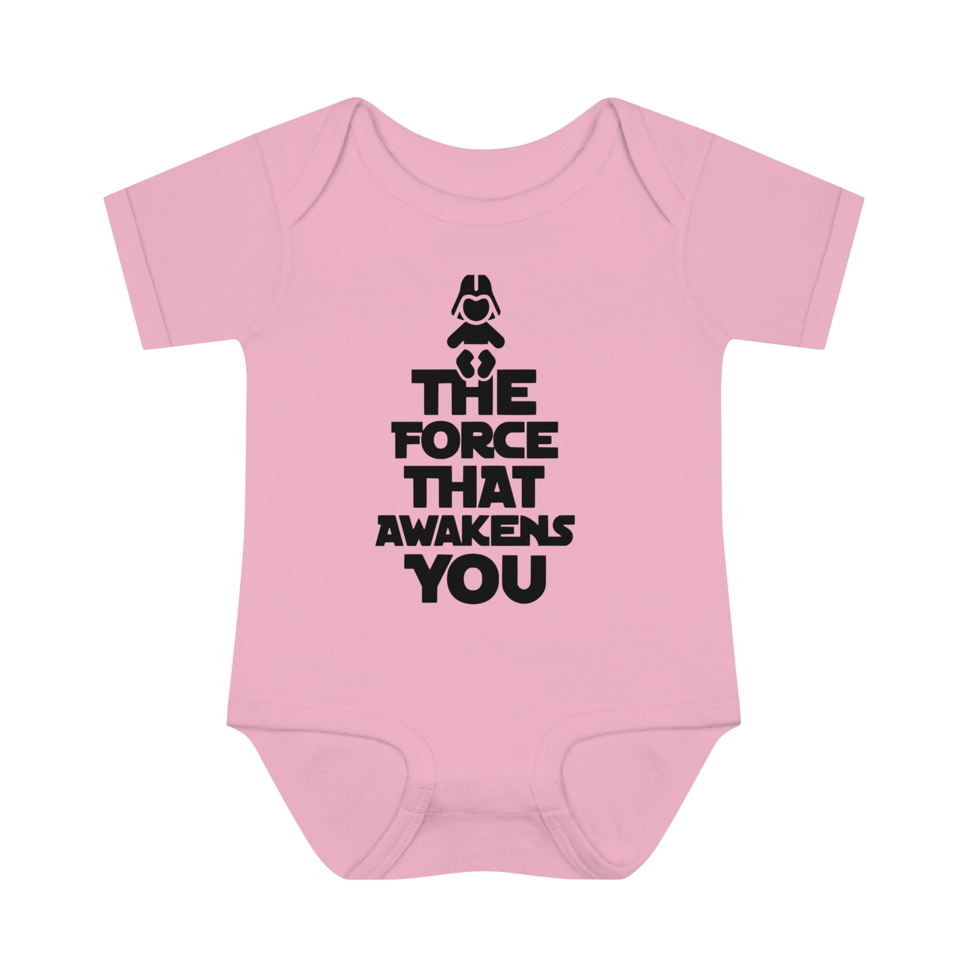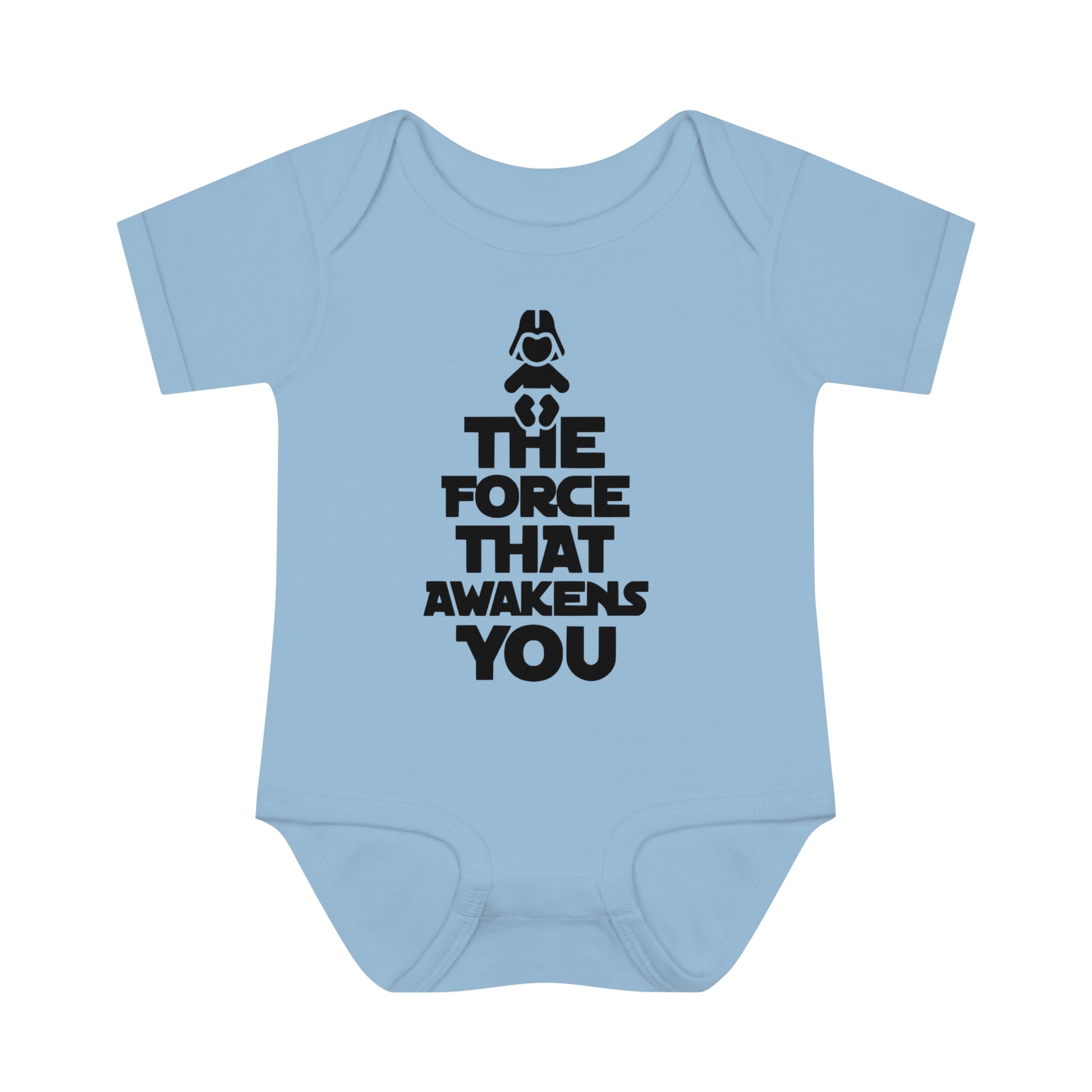 This Jedi inspired Baby bodysuit with "The Force That Awakens You" is made with soft fabric and a unique design, this bodysuit combines style and comfort for your little one. Let them show off their inner Jedi with this fun Baby Bodysuit.
