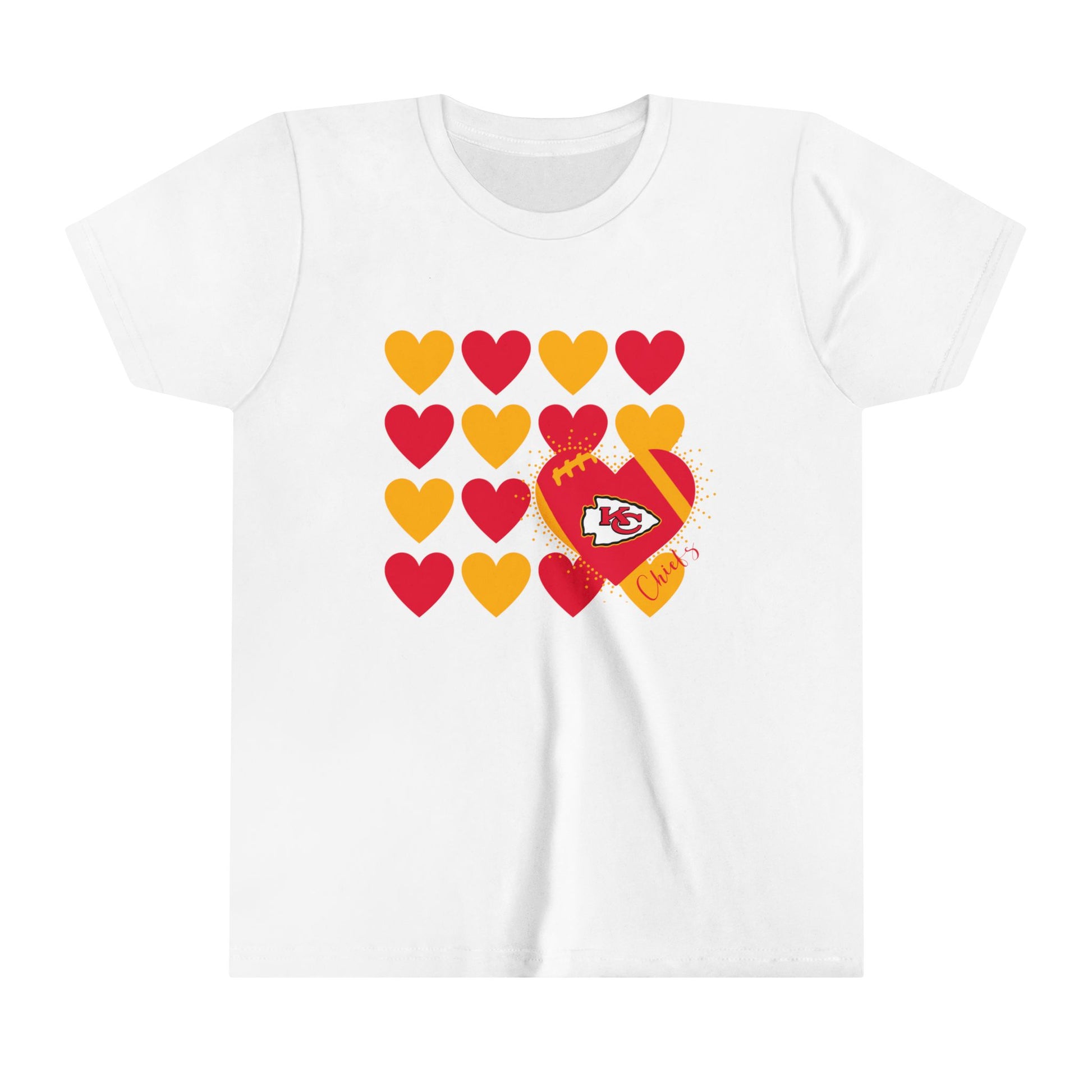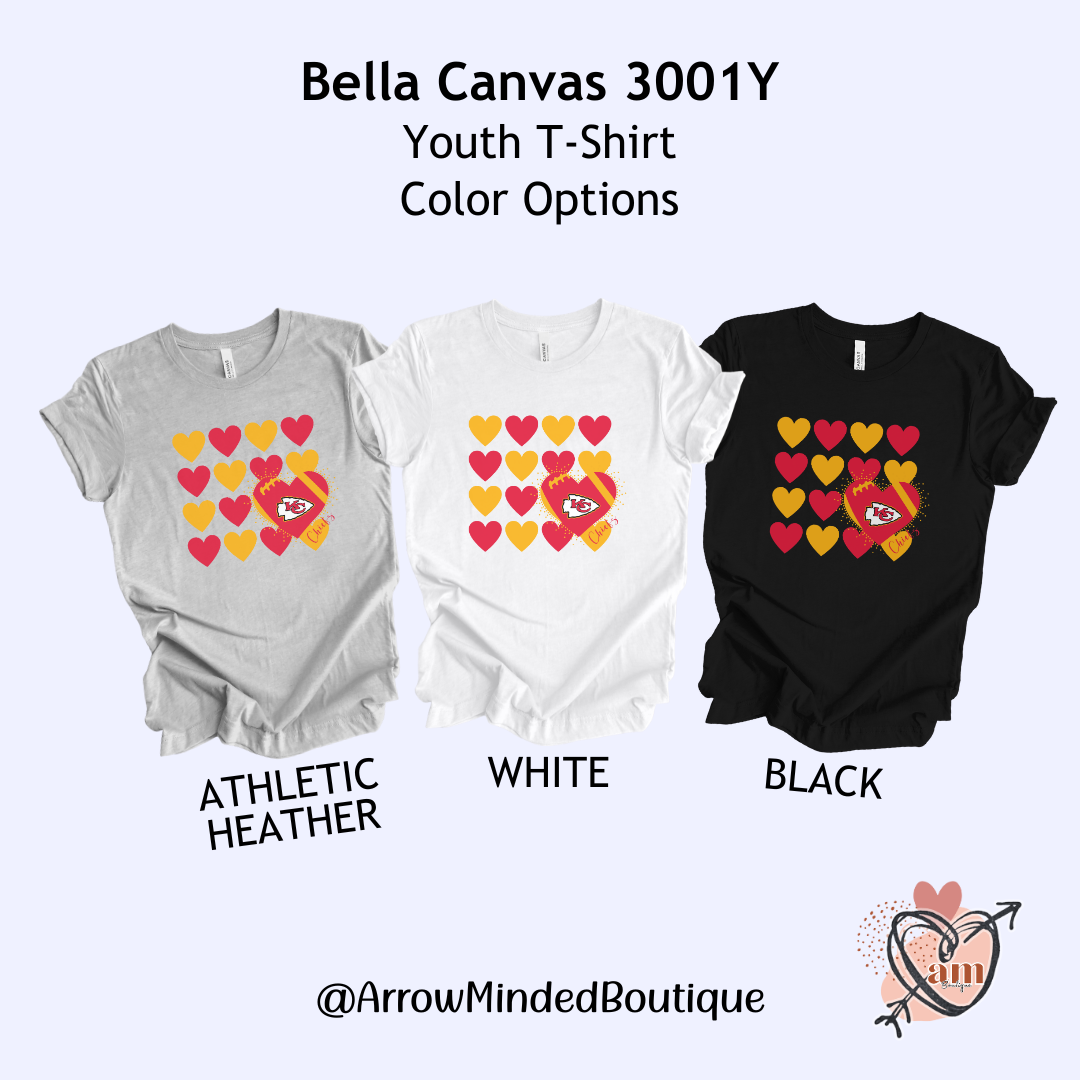 Show your team spirit with this Kansas City Football Youth Tshirt featuring hearts in the team's colors. Made with extra lightweight, ring-spun cotton for maximum comfort, this shirt is perfect for young football fans to wear to games, practices, or casual outings. It makes a great gift for birthdays, holidays, or special occasions.